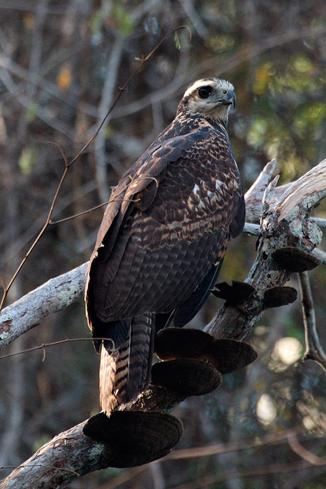 We found this youngster while were were headed upriver. This species is usually considered part of Buteogallus, but genetic data indicates a more distant relation. One way to handle the problem is to put this species in Urubitinga, as I list it here.