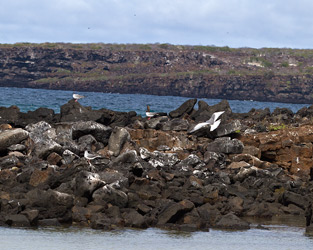 We went out in pangas in mid-afternoon. A short cruise along the cliffs of the caldera revealed a number of nesting birds, including Red-billed Tropicbirds. We also found some Galapagos Fur Seals. They aren't really seals. They are a type of sea lion. Oddly, the two types of sea lion in the Galápagos are not closely related. The Galapagos Sea Lion derives from the California Sea Lion, while the Galapagos Fur Seal is descended from the Subantarctic Fur Seal.