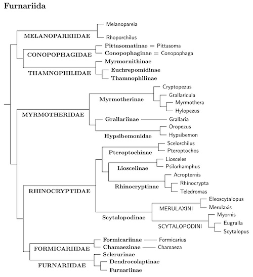 The Myrmotheridae (antpittas) have been separated from the Formicariidae (antthrushes) because the tapaculos are more closely related to the remaining antthrushes than the antpittas are. Similar issues lead to a separation of the Melanopareiidae (crescent-chests) and the Rhinocryptidae (tapaculos). The Pittasoma antpittas have been moved to the Conopophagidae. The tree below shows the basic structure of the Furnariida.