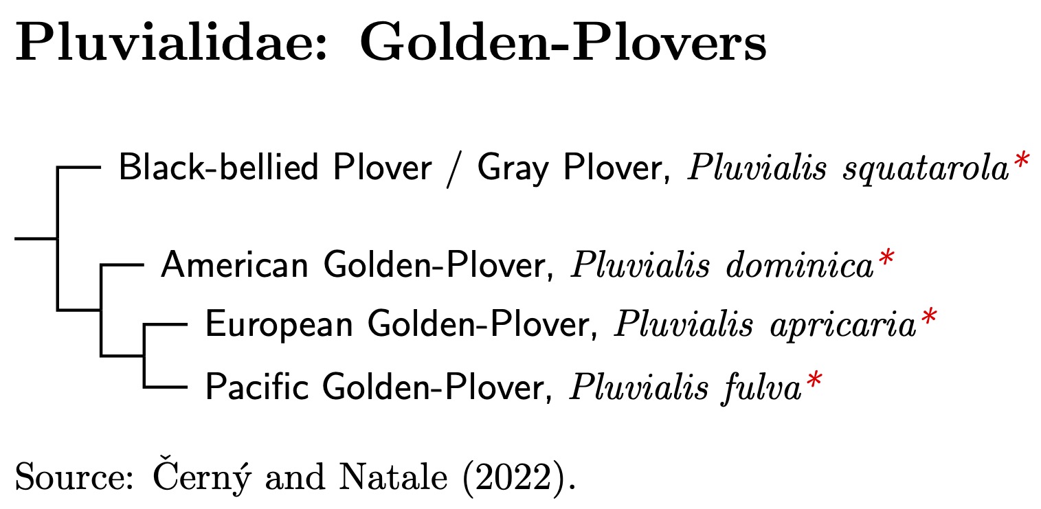 Černý and Natale's genetic phylogenies: The basic structure of the shorebird order is now pretty well worked out. The genetic phylogenies in Černý and Natale (2022) have done much to clarify the details, often down to species level. The total evidence phylogeny from their paper has been used only sparingly as it is hard to tell when non-genetic evidence is useful, and when it just adds noise. Their two genetic phylogenies can be found in the supplemental material, Figures A.31-A.32 and A.33-A.34.